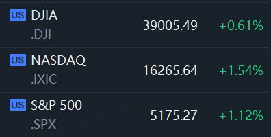 Dow Jones Industrial Average naik 235,74 poin, atau 0,61%, menjadi 39.005,4. S&P 500 naik 57,3 poin, atau 1,12%, pada 5,175.24 dan Nasdaq Composite bertambah 246,36 poin, atau 1,54%, pada 16,265.64.