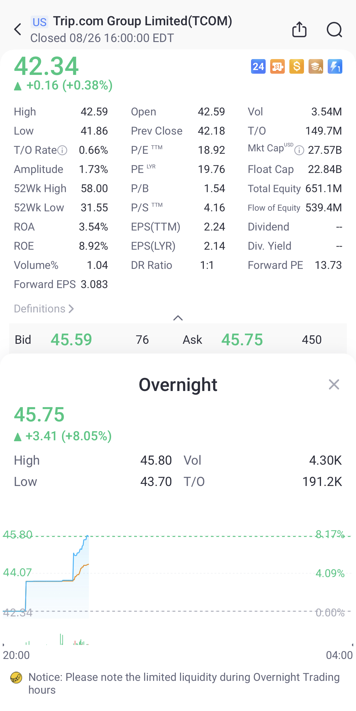 Grup Trip.com naik 8% dalam perdagangan semalam.