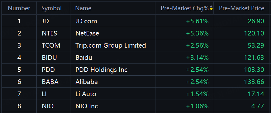 ADR Tiongkok melonjak dalam perdagangan pra-pasar. JD.com, NetEase naik lebih dari 5%; Baidu naik lebih dari 3%; Alibaba, PDD Holdings naik lebih dari 2%.