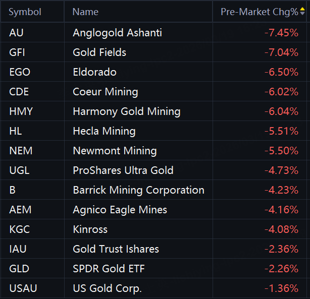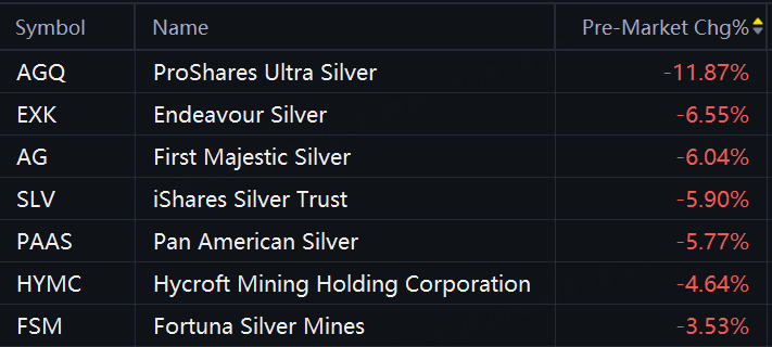 Saham emas, perak, dan ETF tenggelam dalam perdagangan pra-pasar. ProShares Ultra Perak turun 12%; AngloEmas Ashanti, Ladang Emas, Usaha PerakDan Eldorado turun 7%; Perak Agung Pertama, Harmoni Emas, Penambangan Coeur, iShares Kepercayaan Perak, Perak Pan Amerika, Penambangan HeclaDan Pertambangan Newmont turun 6%; ProShares Ultra Emas Dan Penambangan Hycroft turun 5%; Penambangan Barrick, Tambang Elang Agnico, KinrossDan Tambang Perak Fortuna turun 4%; ETF Emas SPDR turun 2%.