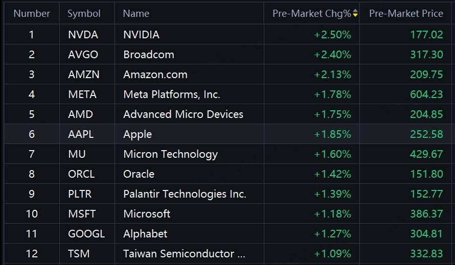 Saham-saham teknologi besar berubah positif setelah penurunan awal. Nvidia, Broadcom, Amazon, Meta, AMD, Apple naik sekitar 2%; Micron, Oracle naik lebih dari 1%.