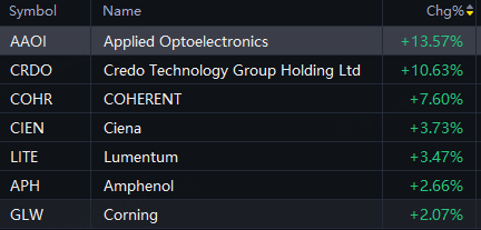 AAOI naik 14%; Teknologi Credo naik 11%; Koheren naik 8%; Ciena naik 4%; Lumentumnya naik 3%.